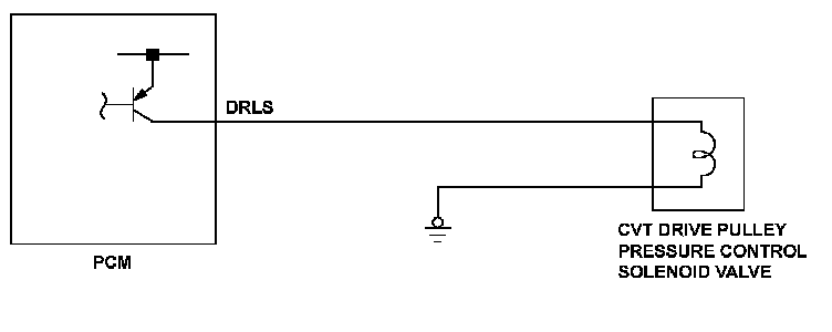 The CVT drive pulley pressure control solenoid valve controls hydraulic pressure to the drive pulley. The CVT drive pulley pressure control solenoid valve is controlled by the duty cycle output. The spool in the CVT drive pulley pressure control solenoid valve pushes the valve according to the current, and produces hydraulic pressure in proportion to the current. The powertrain control module (PCM) measures the current that passes through the CVT drive pulley pressure control solenoid valve and uses feedback control to compensate for the difference between the measured current and the commanded one. If the measured current is not equal to the duty cycle command, the PCM detects a malfunction (open, short to ground) and stores a DTC.
