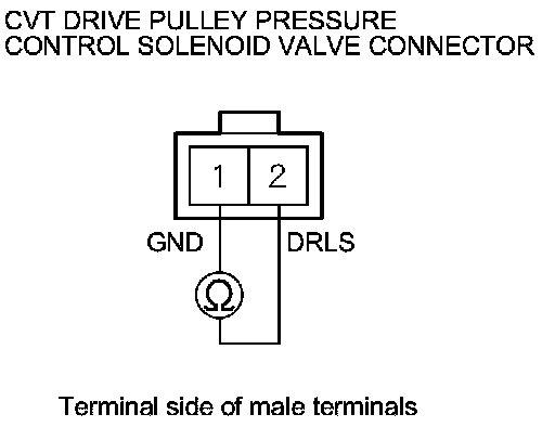 10. Measure the resistance between CVT drive pulley pressure control solenoid valve connector terminals No. 1 and No. 2.