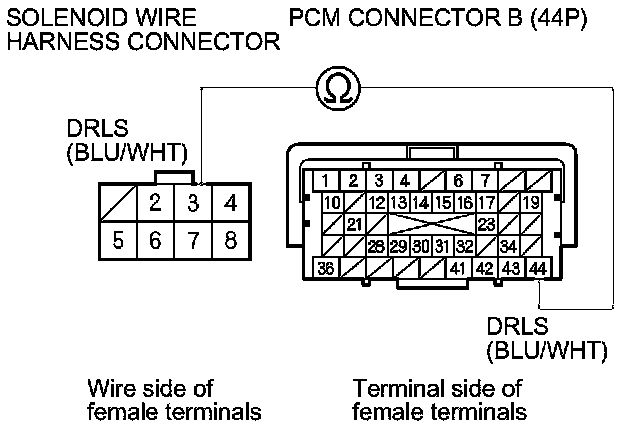 14. Check for continuity between PCM connector terminal B44 and solenoid wire harness connector terminal No. 3.