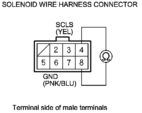 7. Measure the resistance between solenoid wire harness connector terminals No. 4 and No. 8.