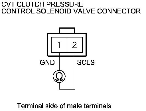 10. Measure the resistance between CVT clutch pressure control solenoid valve connector terminals No. 1 and No. 2.