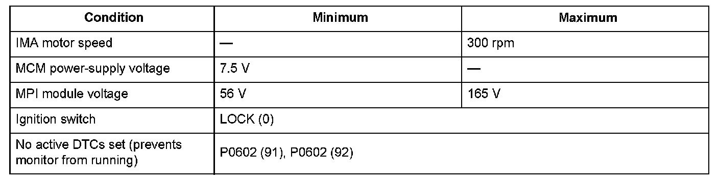 When the ignition switch is turned to LOCK (0) while the integrated motor assist (IMA) system is in an idle stop condition, the high voltage contactor opens and the stored charge in the power drive unit (PDU) capacitor which is built into the motor power inverter (MPI) module, is consumed by the DC-DC converter and lowers the MPI module voltage. But if there is a high voltage contactor turn-on failure, the discharge mentioned above is impossible. Therefore, when the difference between the MPI module voltage value before the high voltage contactor opening process and the MPI module voltage value after the high voltage contactor opening process does not change for a specified duration, a high voltage contactor turn-on failure is detected and a DTC is stored.