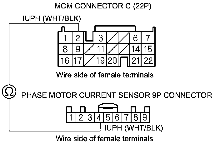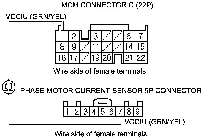 25. Check for continuity between phase motor current sensor 9P connector terminal No. 4 and MCM connector terminal C2.