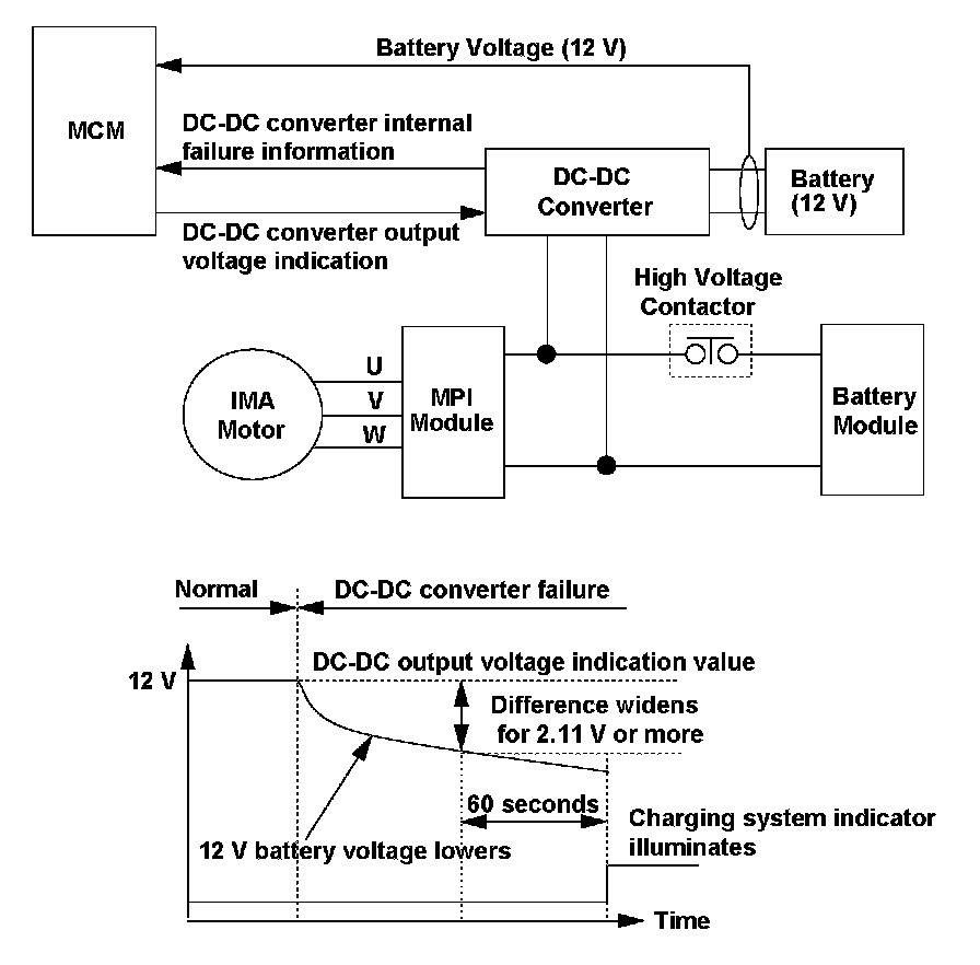 When the DC-DC converter is operating normally, the 12 V battery voltage and the output voltage read by the motor control module (MCM) are within a specified value. When the DC-DC converter malfunctions, the 12 V battery voltage drops. When the DC-DC converter output voltage value commanded by the MCM and the 12 V battery voltage value read by the MCM are compared, and a specified voltage difference condition continues for a set time, or when the MCM receives the internal malfunction information from the DC-DC converter, a DC-DC converter malfunction is detected and a DTC is stored.