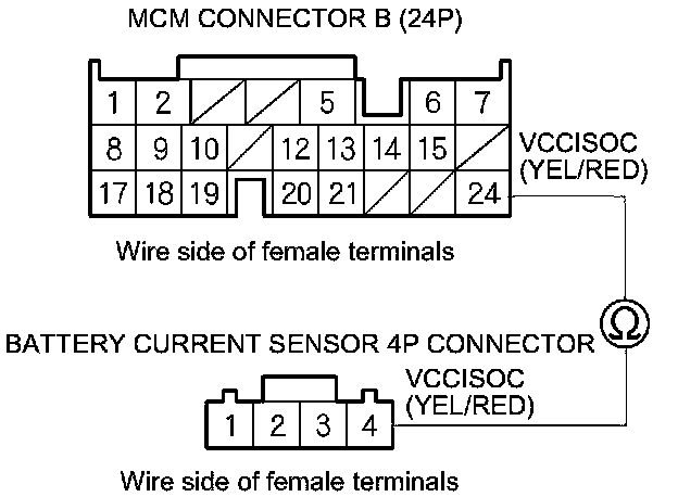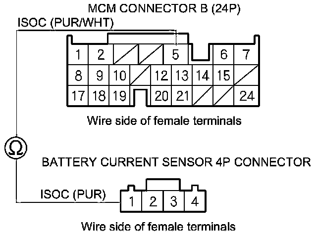 13. Check for continuity between battery current sensor 4P connector terminal No. 4 and MCM connector terminal B24.