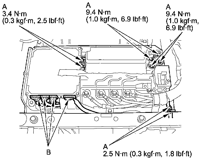 12. Check for poor connections, loose terminals, or damage at the busbars (A) and the MCM connectors (B).