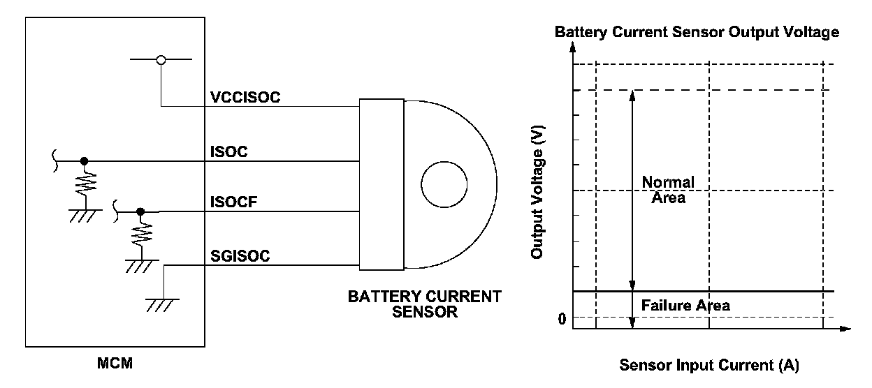 The motor control module (MCM) controls charge/discharge of the battery module based on the battery current sensor signal. When the battery current sensor ISOCF signal voltage is a specified voltage for a set time, the MCM detects a malfunction and stores a DTC.