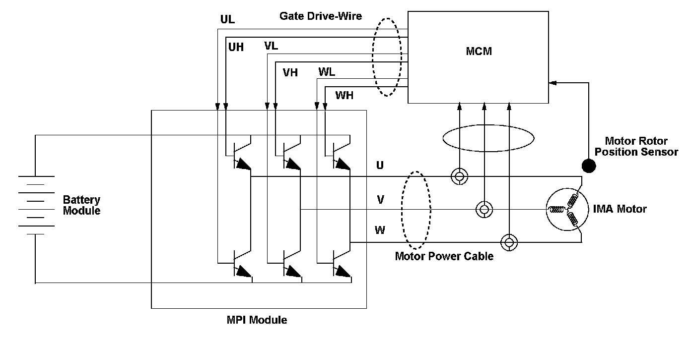 An open in the gate drive-wire, an OFF failure of the motor power inverter (MPI) module, an open in the motor power cable, or an open in the motor coil causes a deviation from the target torque value of the drive motor. The motor control module (MCM) detects these system failures by monitoring each phase current change.