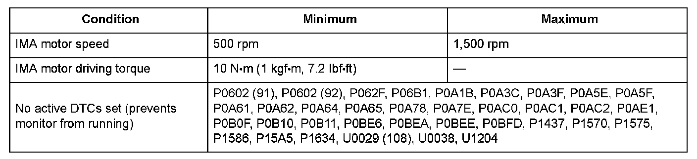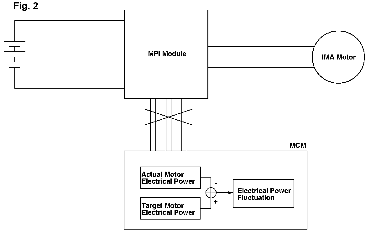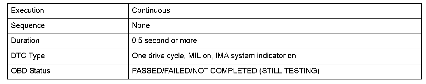 If normal voltage cannot get to the IMA motor because of open circuits in the gate drive-wires, an OFF failure of the MPI module, or a MCM circuit malfunction etc., there is a difference between the target electrical power and the actual motor electrical power. If the electrical deviation is a specified value for a set time, a malfunction is detected and a DTC is stored.