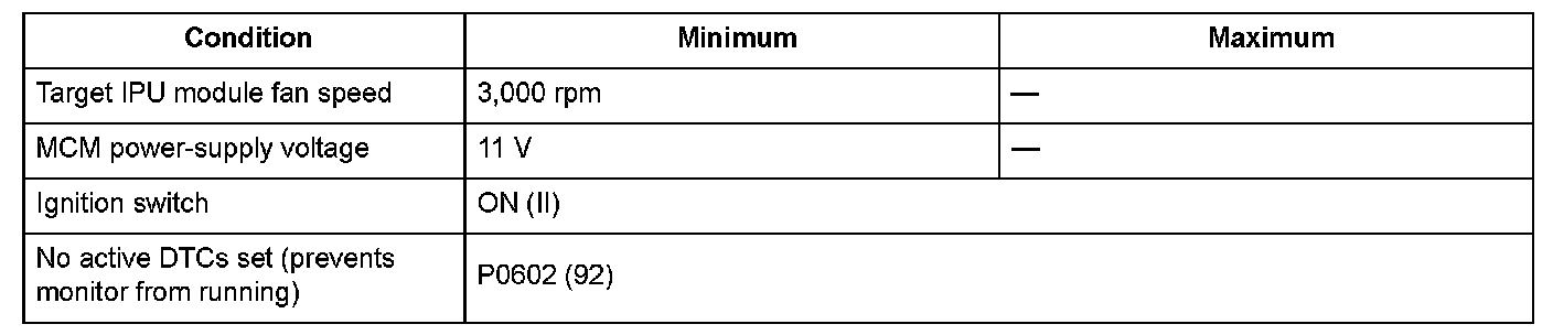 To manage the temperature of the motor power inverter (MPI) module, the DC-DC converter, and the battery module, the integrated motor assist (IMA) system is equipped with an intelligent power unit (IPU) module fan. When a malfunction occurs in the IPU module fan, the motor assist is unable to regenerate and the IMA system is shut down because the module temperature increases. A malfunction in the IPU module fan is detected to avoid problems caused by overheating. If the IPU module fan is functioning normally, when the MCM operates the IPU module fan, it should be operated within a specified speed range. The MCM compares the actual IPU module fan speed to the IPU module fan duty cycle, and if the actual speed does not reach a specified value, the MCM detects a malfunction and stores a DTC.