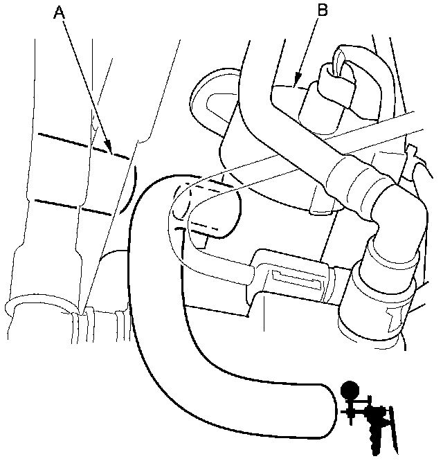 23. Disconnect the fresh air hose (A) from the EVAP canister (B), then connect a vacuum pump/gauge to the EVAP vent shut valve as shown.