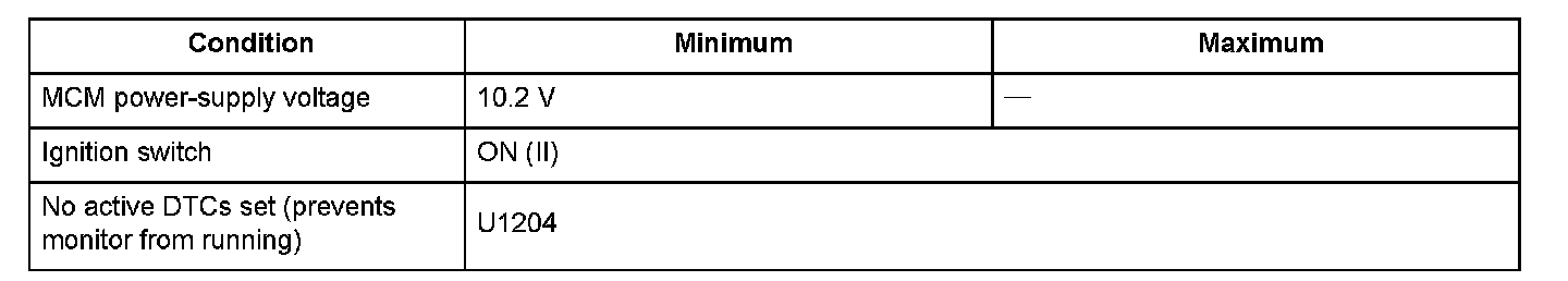 When a malfunction is detected during the first drive cycle, a Pending DTC is stored in the MCM memory. If the malfunction returns in the next (second) drive cycle, a Confirmed DTC and the freeze data are stored. The MIL does not come on.
