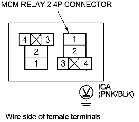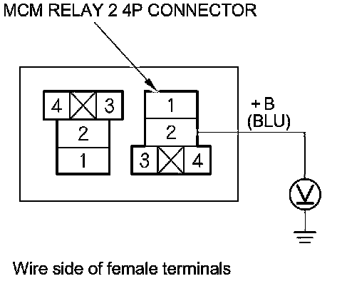14. Measure the voltage between MCM relay 2 4P connector terminal No. 2 and body ground.