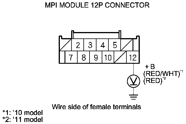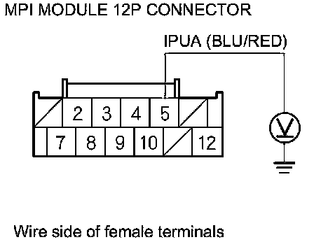 25. Measure the voltage between MPI module 12P connector terminal No. 5 and body ground.