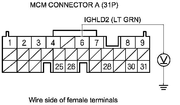 36. Measure the voltage between MCM connector terminal A6 and body ground.