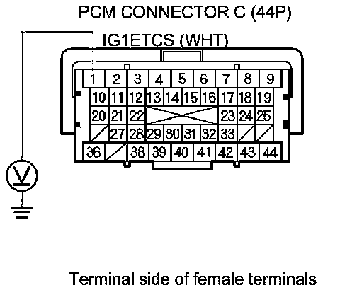 11. Measure the voltage between PCM connector terminal C1 and body ground.