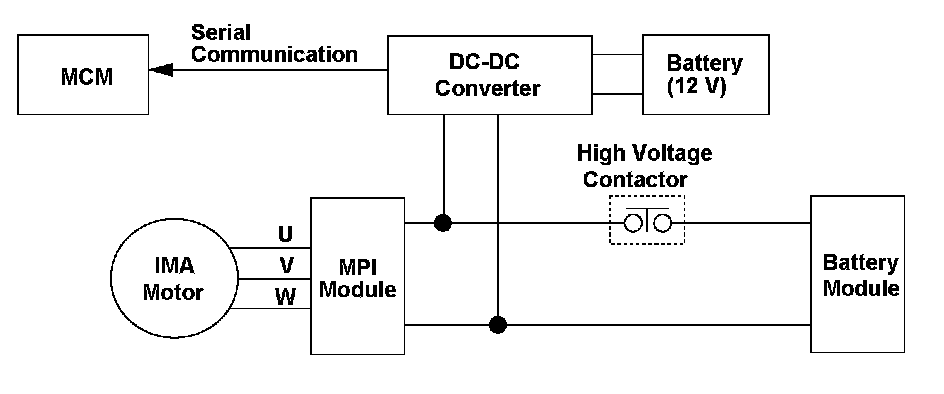 Temperature abnormalities are detected by the microcomputer in the DC-DC converter, and this information is sent to the motor control module (MCM) via serial communication. When the abnormal temperature sensor information continues for a set time, the MCM detects a malfunction and stores a DTC.