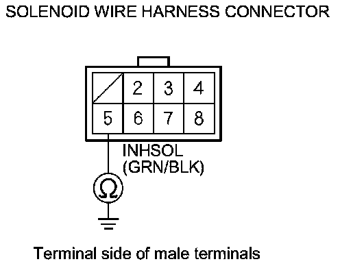7. Measure the resistance between solenoid wire harness connector terminal No. 5 and body ground.