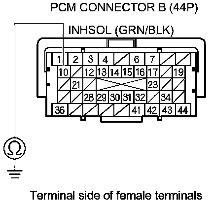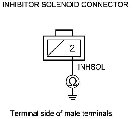 10. Measure the resistance between inhibitor solenoid connector terminal No. 2 and body ground.