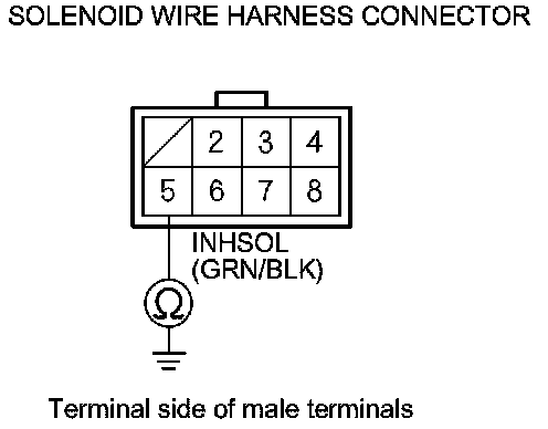7. Measure the resistance between solenoid wire harness connector terminal No. 5 and body ground.