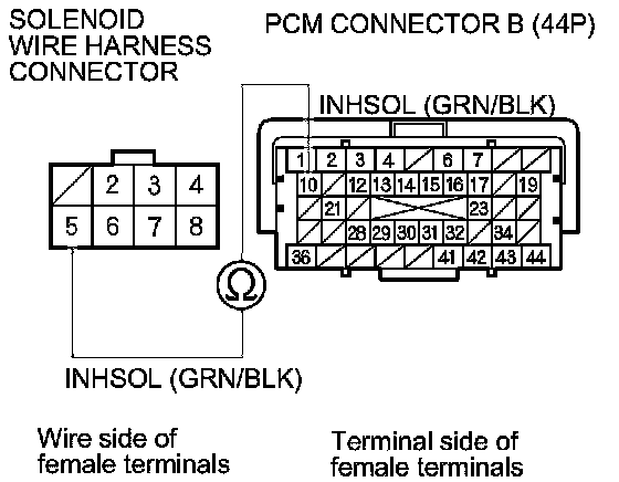 13. Check for continuity between PCM connector terminal B10 and solenoid wire harness connector terminal No. 5.