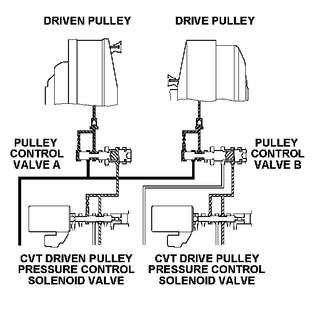 The CVT drive pulley pressure control solenoid valve and the CVT driven pulley pressure control solenoid valve control hydraulic pressure. When the pulley ratio with the vehicle stopped and the throttle closed is low when shifted to D, S, or L, and the pulley ratio when driving is also low, the powertrain control module (PCM) detects a malfunction and stores a DTC.