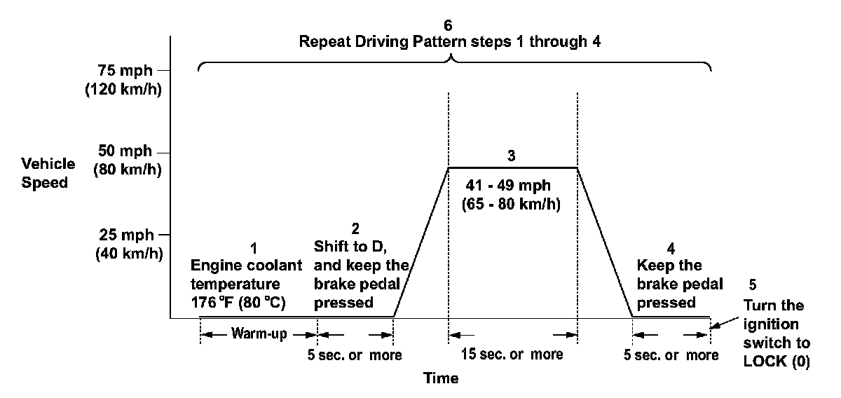 3. Drive the vehicle and accelerate to 41 - 49 mph (65 - 80 km/h) on a flat road and drive at least 15 seconds at 41 - 49 mph (65 - 80 km/h). (Do not release the accelerator pedal during the test-drive.)