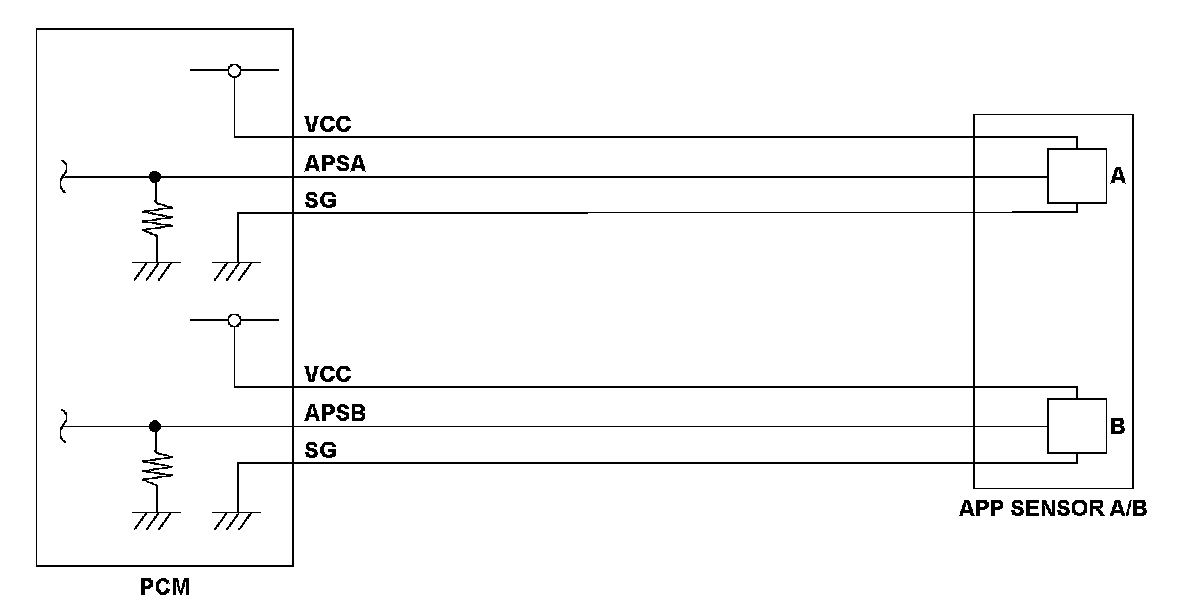 Accelerator pedal position (APP) sensor A is a part of the electronic throttle control system. It is used to convert the position of the accelerator pedal into electrical signals. Based on these signals, the powertrain control module (PCM) controls the throttle actuator so that the throttle position agrees with the accelerator pedal position. If the signal voltage from APP sensor A is a set value, the PCM detects a malfunction and stores a DTC.