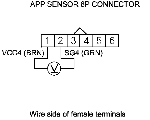 6. Measure the voltage between APP sensor 6P connector terminals No. 1 and No. 2.