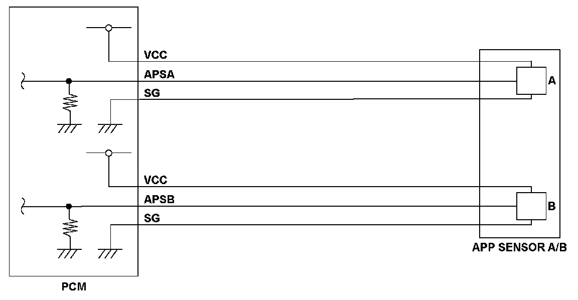 Accelerator pedal position (APP) sensor A is a part of the electronic throttle control system. It is used to convert the position of the accelerator pedal into electrical signals. Based on these signals, the powertrain control module (PCM) controls the throttle actuator so that the throttle position agrees with the accelerator pedal position. If the signal voltage from APP sensor A is a set value, the PCM detects a malfunction and stores a DTC.