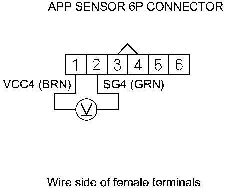 6. Measure the voltage between APP sensor 6P connector terminals No. 1 and No. 2.