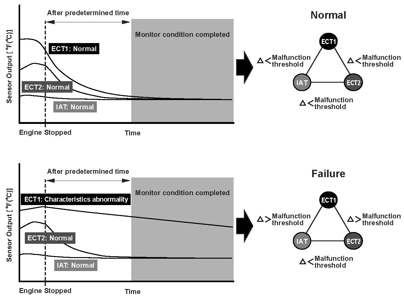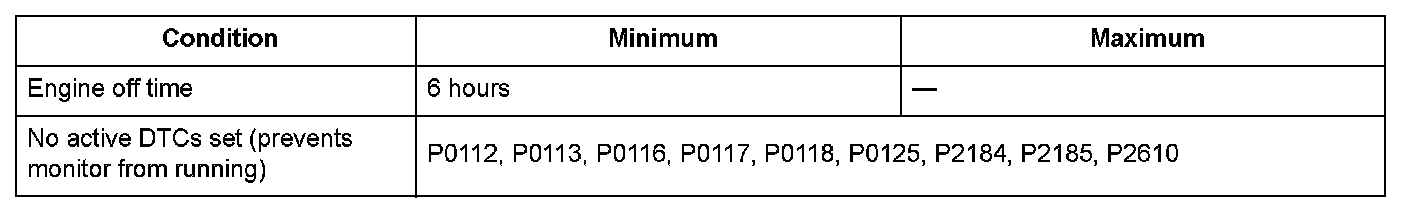 Two engine coolant temperature (ECT) sensors and one intake air temperature (IAT) sensor are used by the powertrain control module (PCM). When the engine is stopped and enough time has passed, the temperature of the engine will equalize to the ambient temperature. When an inappropriate temperature is detected after comparing the temperature readings of each sensor, the PCM detects a malfunction in the corresponding sensor and stores a DTC.
