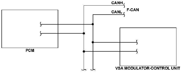 The controller area network (CAN) transmits/receives pulsing signals to/from the control modules simultaneously by using two signal lines (CANH and CANL). When the information is not sent from the VSA modulator-control unit via the F-CAN lines and this condition continues for a specified time or when the information sent from the VSA modulator-control unit is abnormal and this condition continues for a specified cycle, the powertrain control module (PCM) detects a malfunction and stores a DTC.