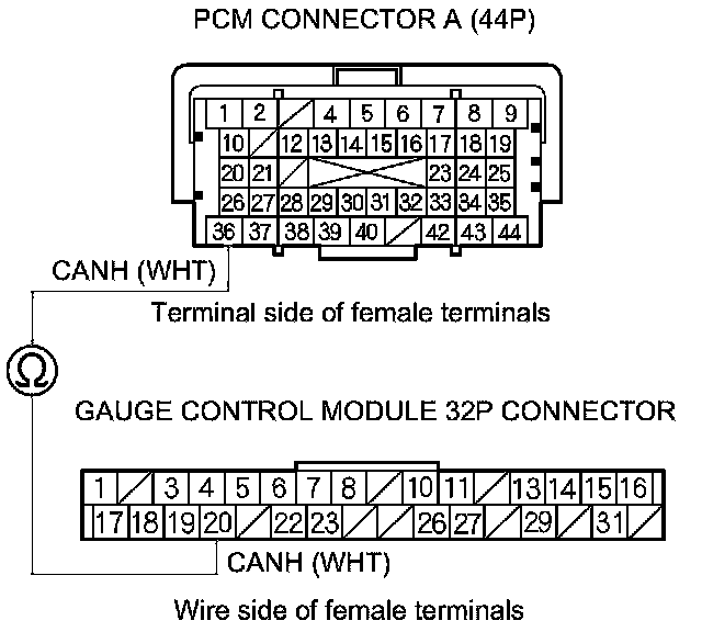 10. Check for continuity between PCM connector terminal A36 and gauge control module 32P connector terminal No. 20.