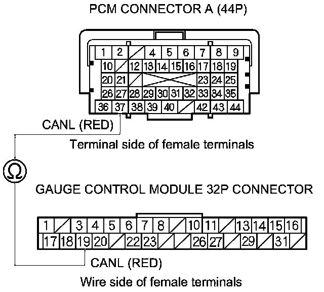 11. Check for continuity between PCM connector terminal A37 and gauge control module 32P connector terminal No. 19.