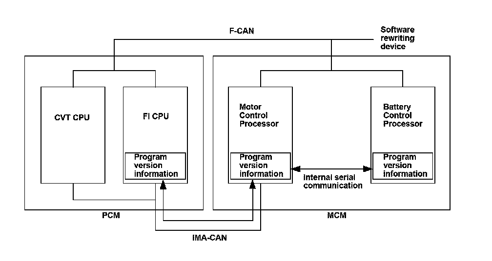 The motor control processor and the battery control processor softwares which are in the motor control module (MCM) and the FI CPU which is in the powertrain control module (PCM) can be updated by a software rewriting device connected via the F-CAN lines. When the battery control processor and the FI CPU, or the motor control processor need to be updated but either processor fails rewriting, the indicator comes on and stores a DTC. Each processor stores a program version information, and compare their versions to each other by transmitting/receiving via the serial communication. If the battery control processor judges that its own software version is old, a malfunction is detected and a DTC is stored.