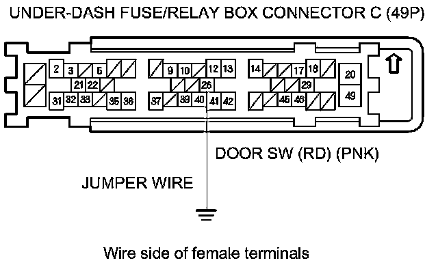 12. Connect under-dash fuse/relay box connector C (49P) terminal No. 26 and body ground with a jumper wire.