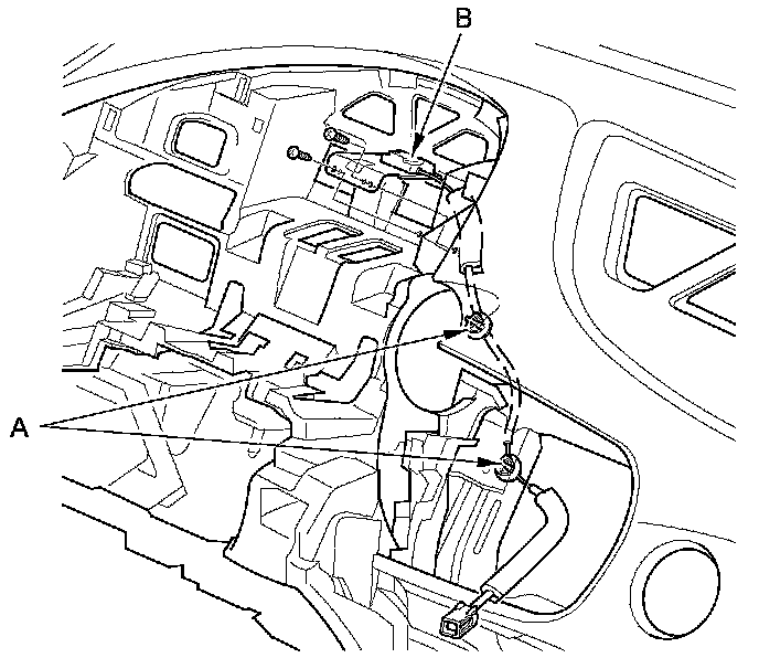 3. Remove the wire harness clips (A), the screws, and the GPS antenna (B).
