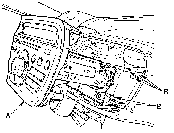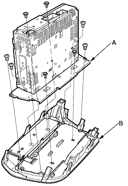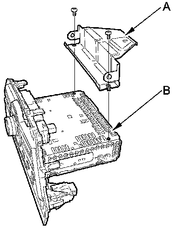 10. Remove the mounting screws and bracket (A) from the audio unit (B).