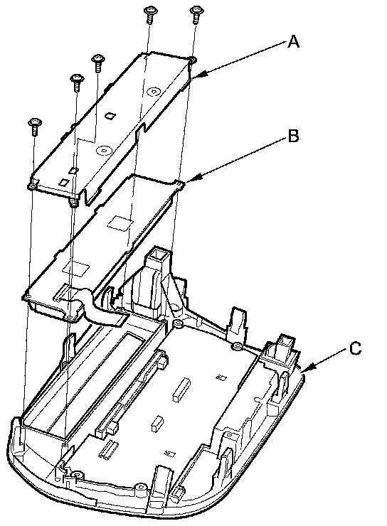 12. Remove the screws and LCD plate (A) and the display assembly (B) from center panel (C).