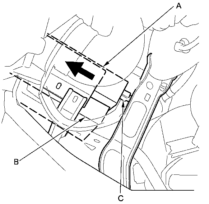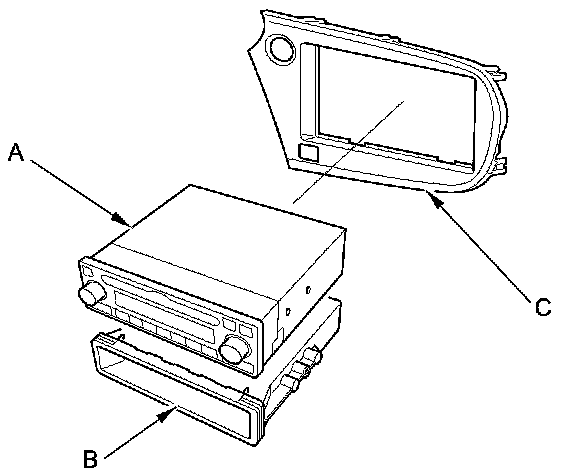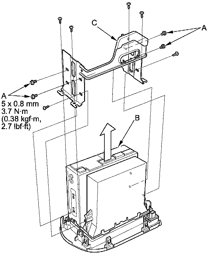 10. Remove the mounting bolts (A) and screws from the audio unit (B), then remove the bracket (C).