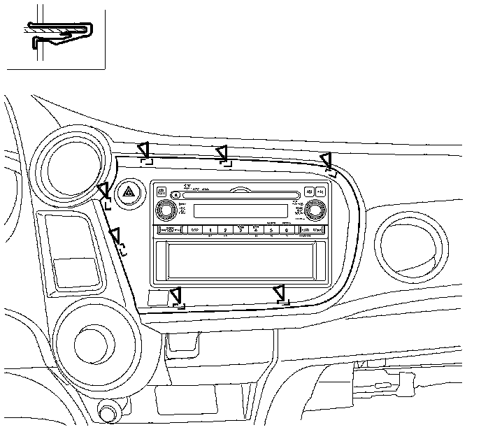 7. Lift the panel, taking care not to damage the dashboard. Insert the appropriate tool into the gap between the dashboard and the panel, then release the clips in order from the gap side.