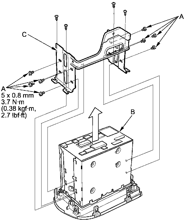 11. Remove the mounting bolts (A), and screws, from the audio-navigation unit (B), then remove the bracket (C).