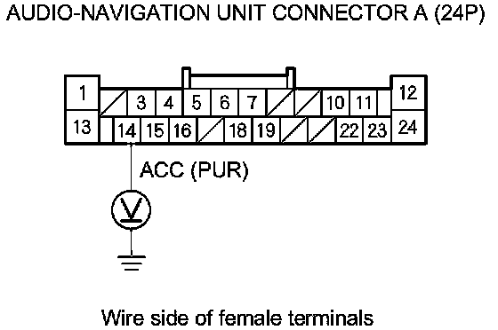4. Measure the voltage between audio-navigation unit connector A (24P) terminal No. 14 and body ground.
