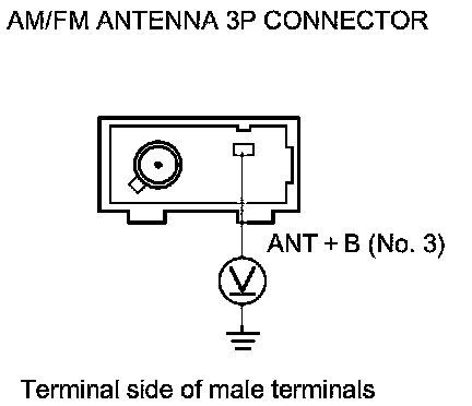 10. Measure the voltage between AM/FM antenna 3P connector terminal No. 3 and body ground.