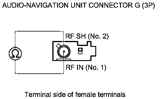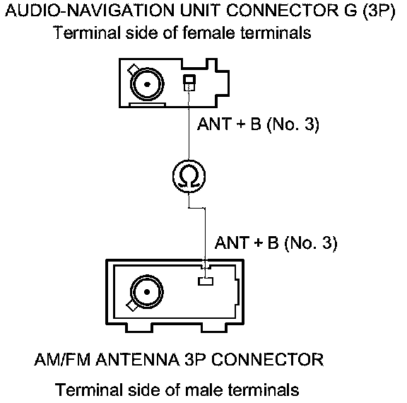 13. Check for continuity between audio-navigation unit connector G (3P) terminal No. 3 and AM/FM antenna 3P connector terminal No. 3.