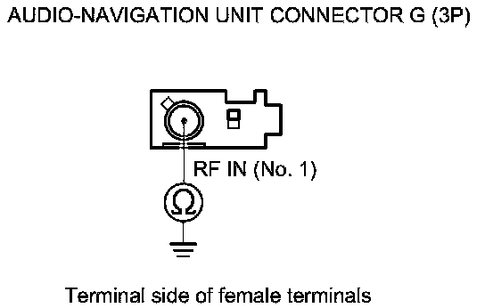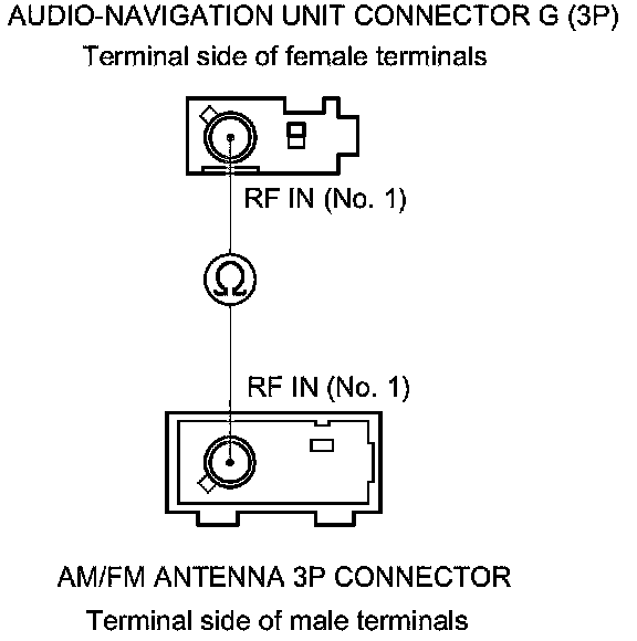 17. Check for continuity between audio-navigation unit connector G (3P) terminal No. 1 and AM/FM antenna 3P connector terminal No. 1.