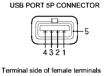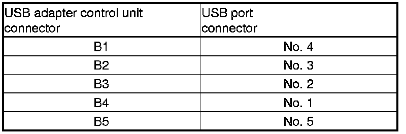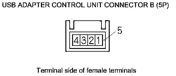 14. Check for continuity between USB adapter control unit connector B (5P) and USB port 5P connector according to the table.