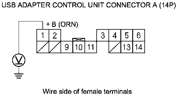 16. Measure the voltage between USB adapter unit connector A (14P) terminal No. 1 and body ground.