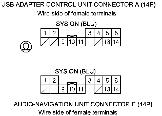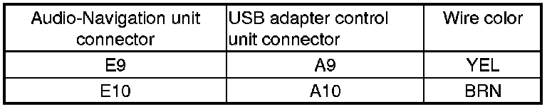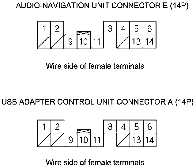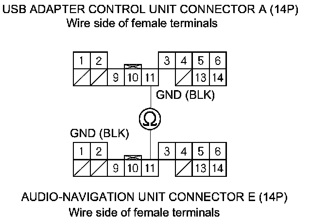 25. Check for continuity between audio-navigation unit connector E (14P) and USB adapter control unit connector A (14P) according to the table.